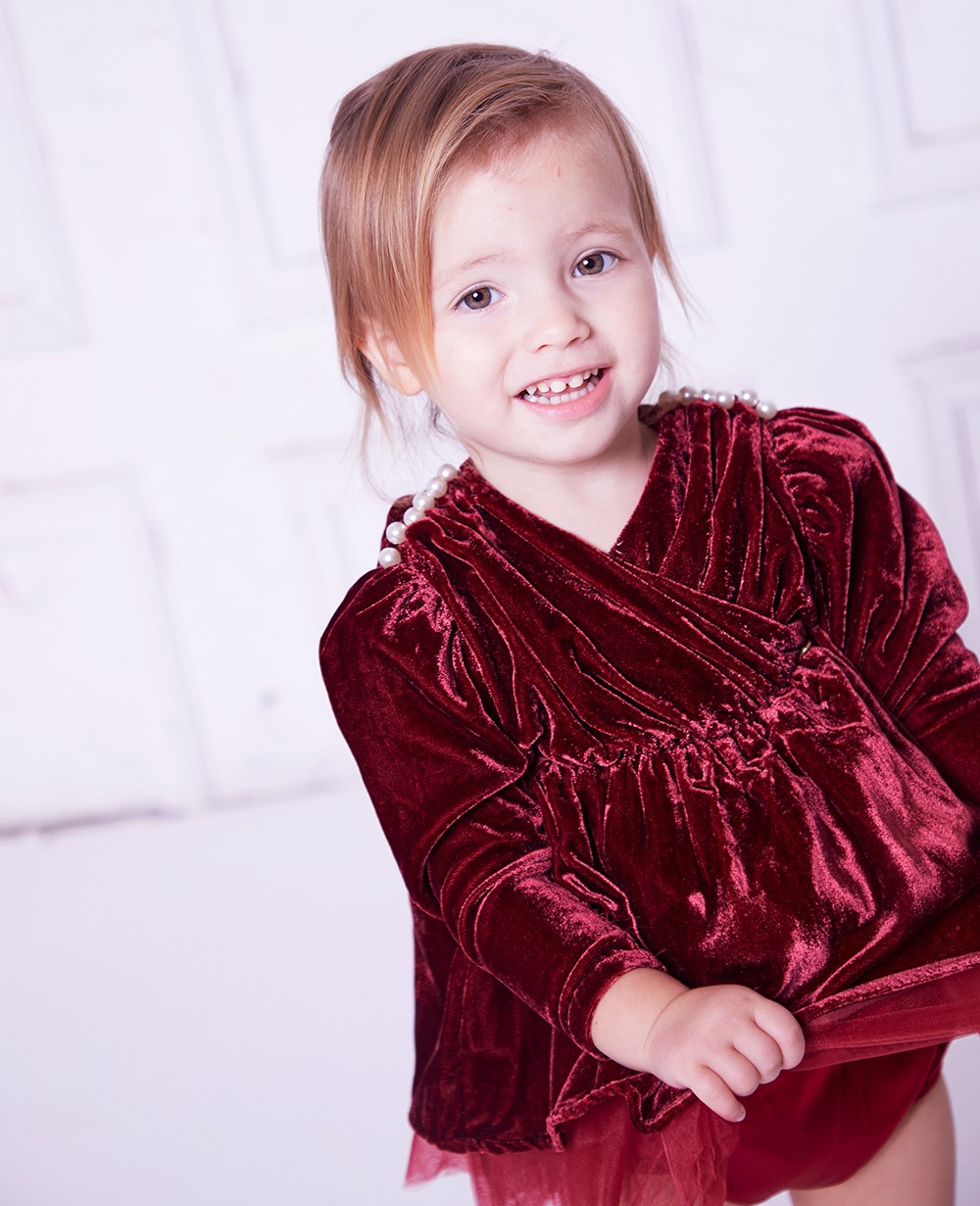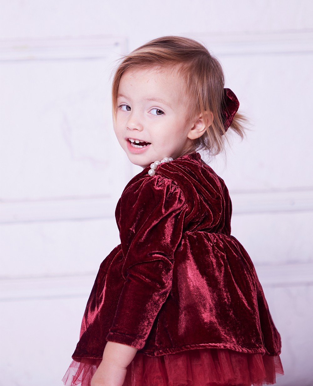 A standout piece in this seasons collection is this stunning dress made with red velvet .red velvet pleated cross the body, red tulle on the bottom creates an elegent silhouette. The puff long sleeves dress is lined in satin backed in soft cotton, and fastens with a zip on the back. Comes with a pearl hanger and Le Mu dress bag