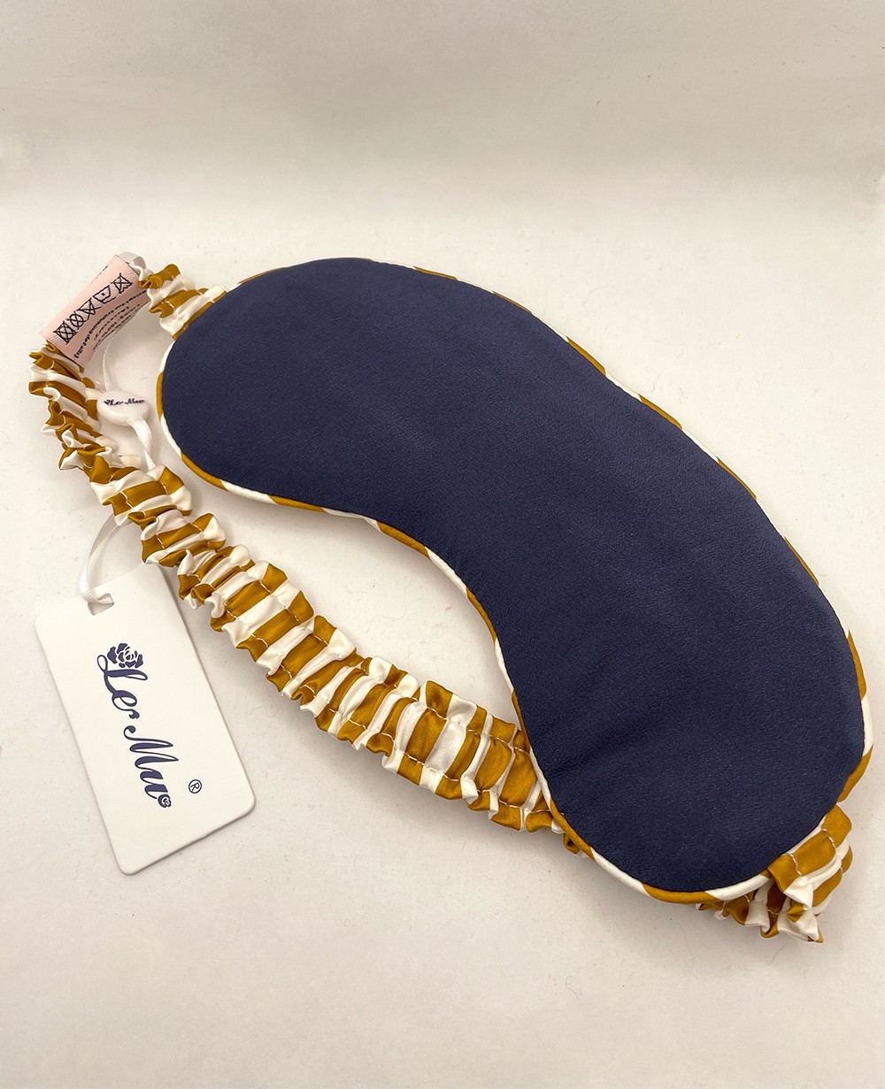 Yellow stripe eye mask for girls by Le Mu, made in soft satin ,lightly padded, with lightweight slik linling, it has an elasticated strap and comes in a matching yellow stripe bag. Matching pajamas are available.