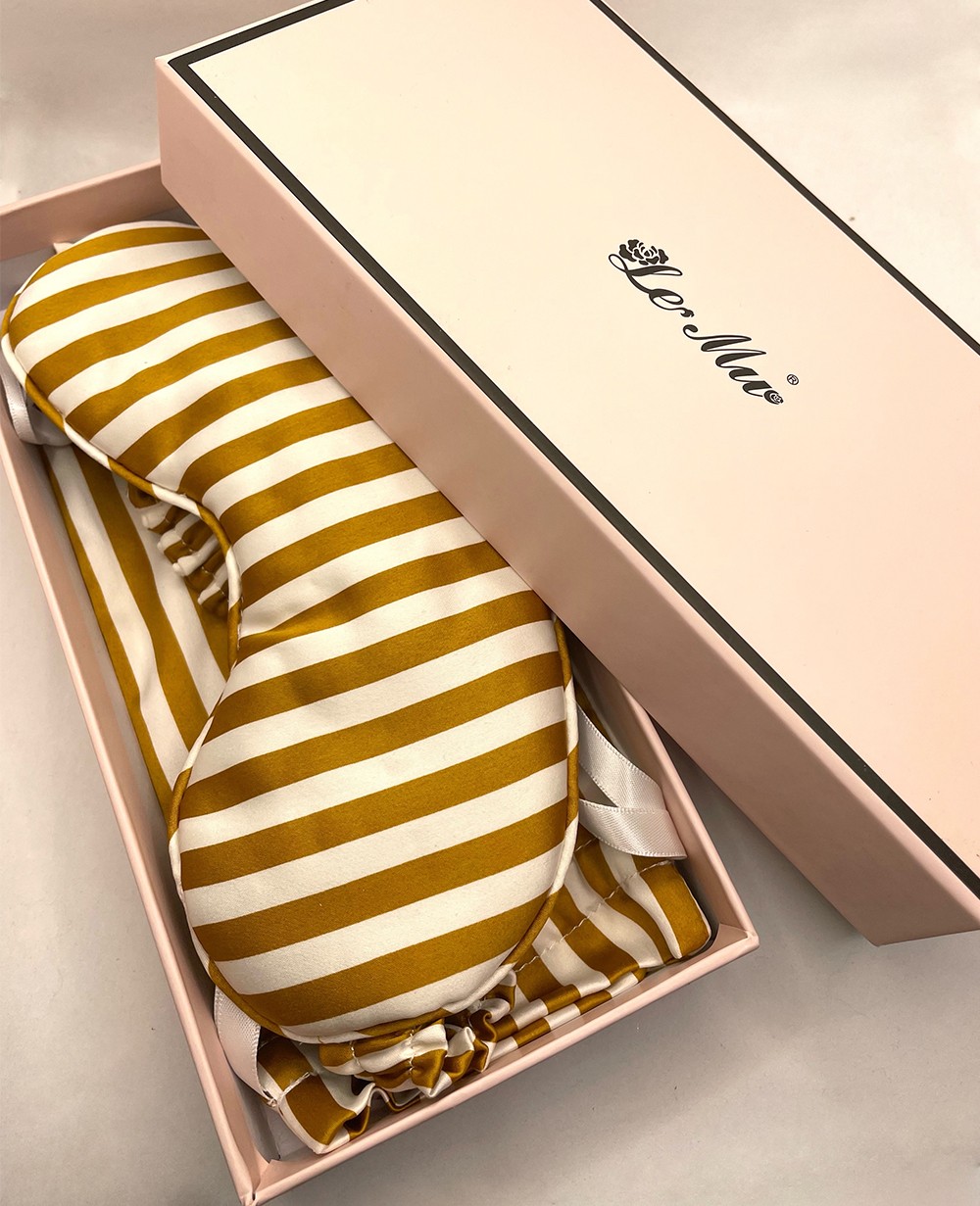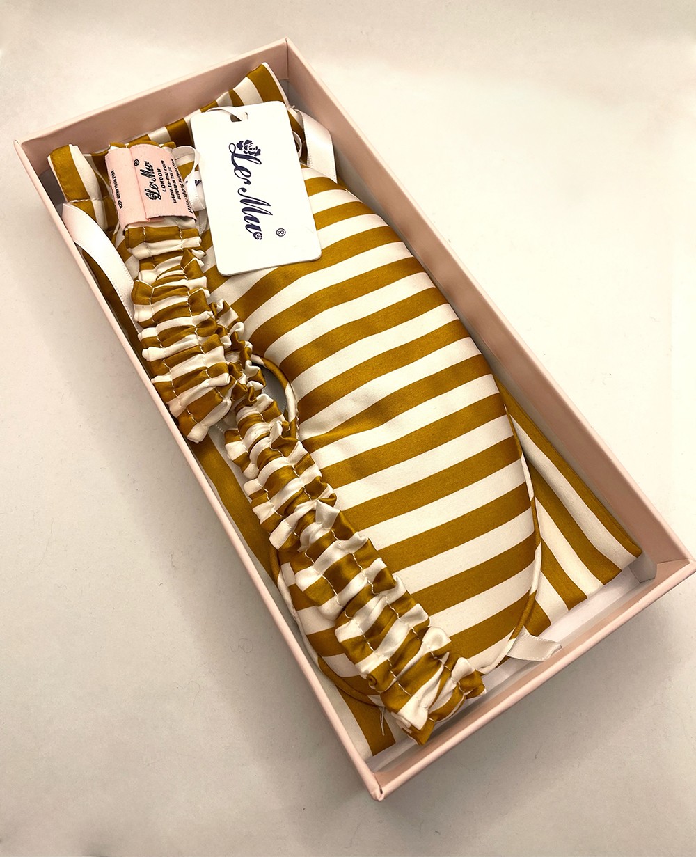 Description Yellow stripe eye mask for girls by Le Mu, made in soft satin ,lightly padded, with lightweight slik linling, it has an elasticated strap and comes in a matching yellow stripe bag. Matching pajamas are available.