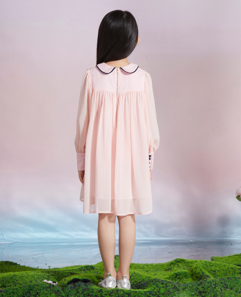 Description Girls stylish linen chiffon dress by Le Mu. navy trimmed detail on the collar and lace sequin detail around the chest give the dress elegant feeling. this pink chiffon long sleeve dess lined in soft cotton for comfort. Fastens with a zip on the back and comes with a pearl hanger and Le Mu dress bag.