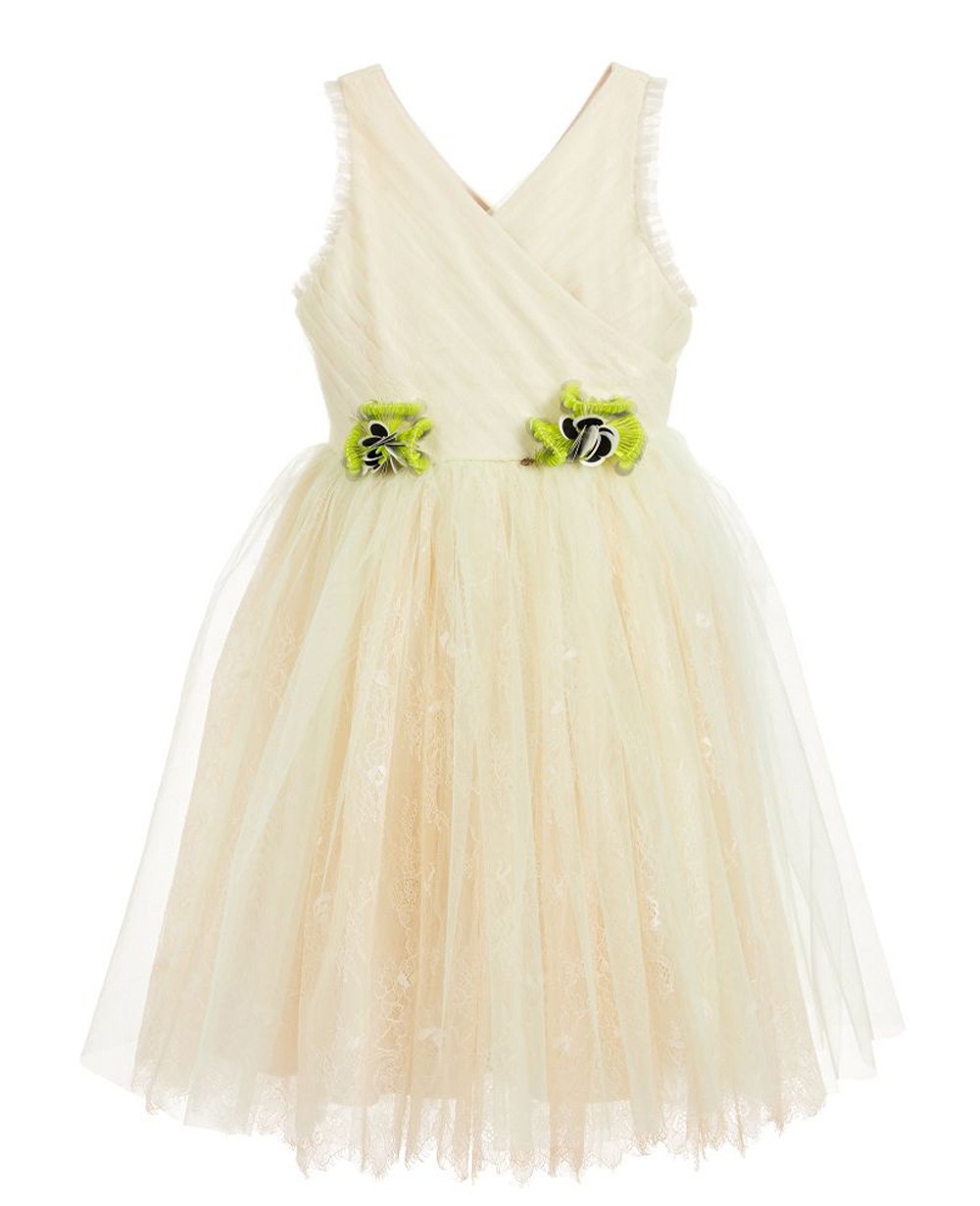 | Description | A gorgeous beige lace dress for girls by Le Mu, made in layers of green tulle and beige lace, sleeveless,creating an elegant silhouette. The cross-over bodice has pleated tulle detail, gathered at the waist with a full skirt. On the front, there are pretty green, white and black sequined flowers. A perfect princess dress for formal occasions.Come with hanger and dust bag. |