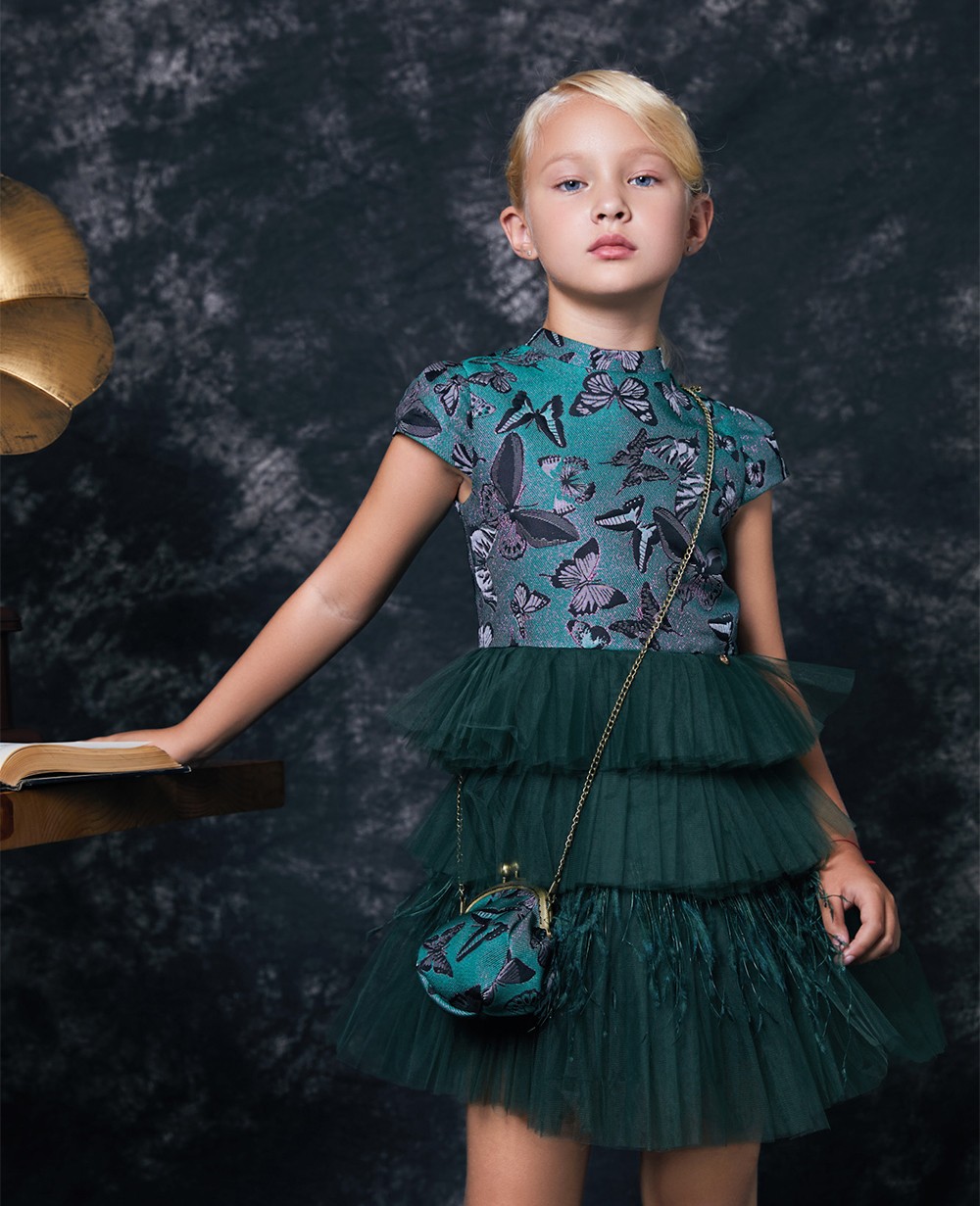 Stunning emerald green dress by Le Mu, with a tiered tulle and feather skirt. The bodice is made in jacquard, with sparkling pink thread and black butterfly motif. The jacquard and tulle dress is lined in satin backed with soft cotton voile, and it fastens with a zip on the back.Come with hanger and dust bag.