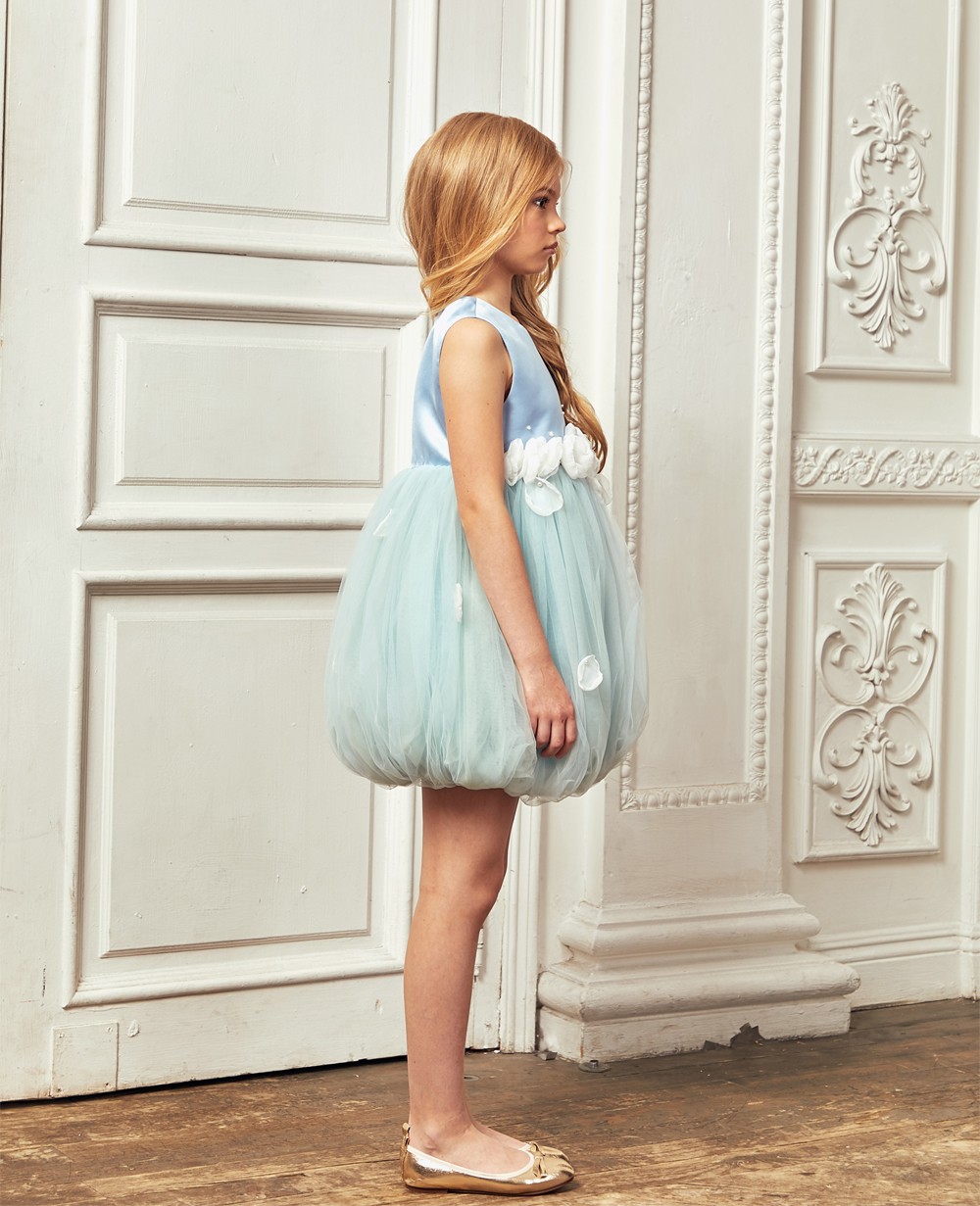 | Description | This stunning dress is made with baby blue satin with green tuelle. The white organza flora embelishment is decorated on the chest, combined with blue and green tuelle giving the dress full of layers and creating a beautiful silhouette. The sleeveless dress falls above knees and is lined in satin backed in soft cotton, and it fastens with a zip on the back. Comes with a pearl hanger and Le Mu dress bag |