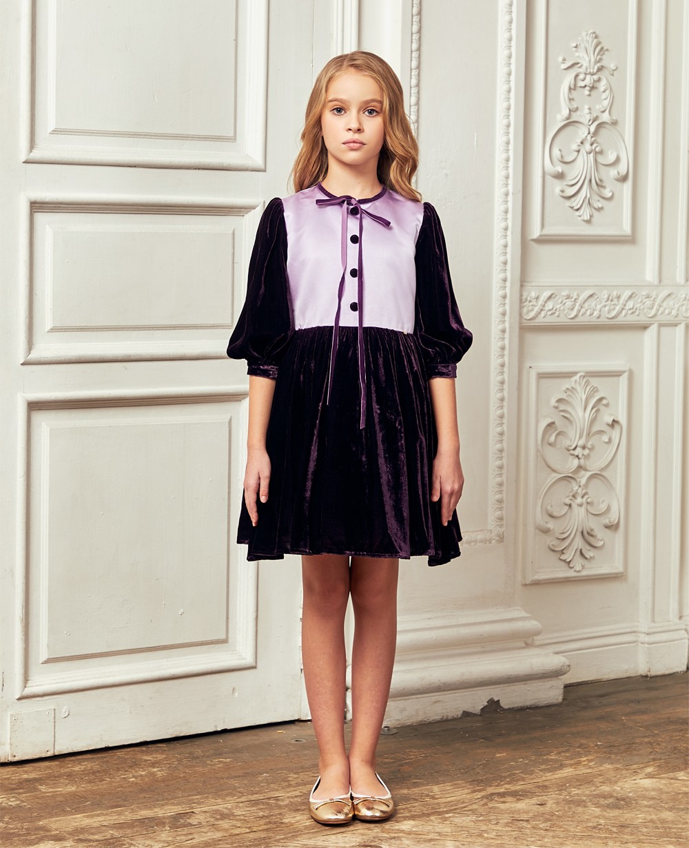 An elegant, special occasion dress by Le Mu, made in luxury soft dark purple v velvet with lilac satin. This velet dress is lined in satin backed in soft cotton, and it fastens with a zip on the back. Comes with a pearl hanger and Le Mu dress bag