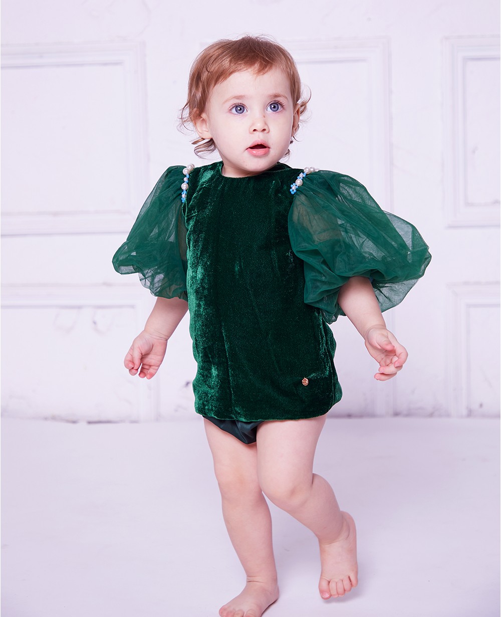 | Description | This stunning dress is made with green velvet . it has blue crystal with pearl details decorated on the shoulder , puff sleeves creating a beautiful silhouette. the green velvet tuelle sleeves dress fall above knees and is lined in soft cotton, and it fastens with a zip on the back. Comes with a pearl hanger and Le Mu dress bag |