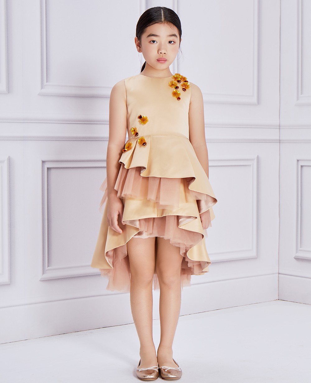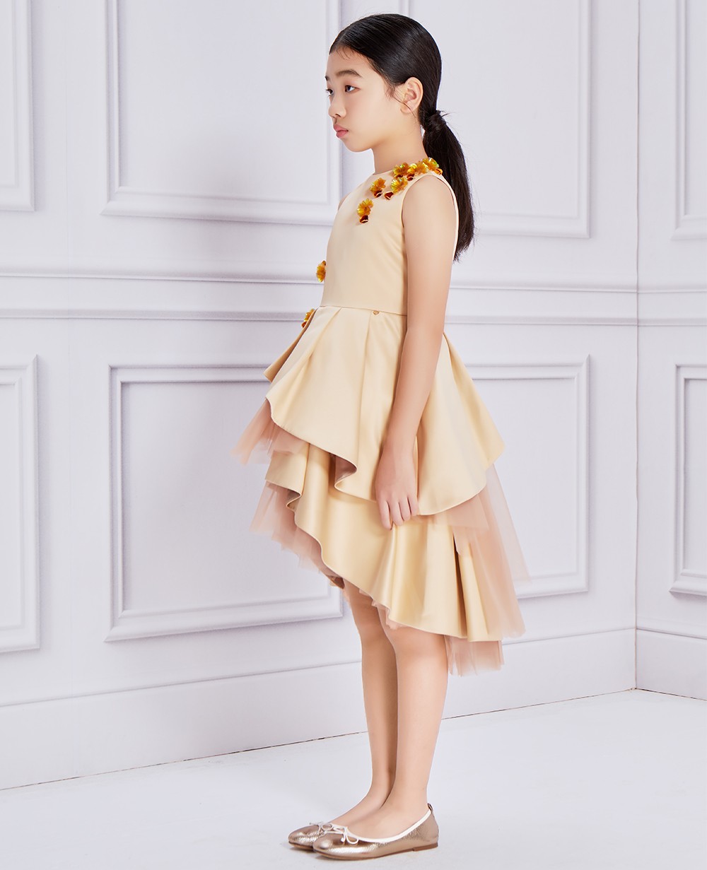 | Description | This gorgeous golden dress is made with gold satin, and a gold flora embellishment intersperse on the chest and waist. Pleated satin with gold tulle gives the dress full of layers. This gold flora embellishment dress is lined in satin backed in soft cotton, and it fastens with a zip on the back. Comes with a pearl hanger and Le Mu dress bag |