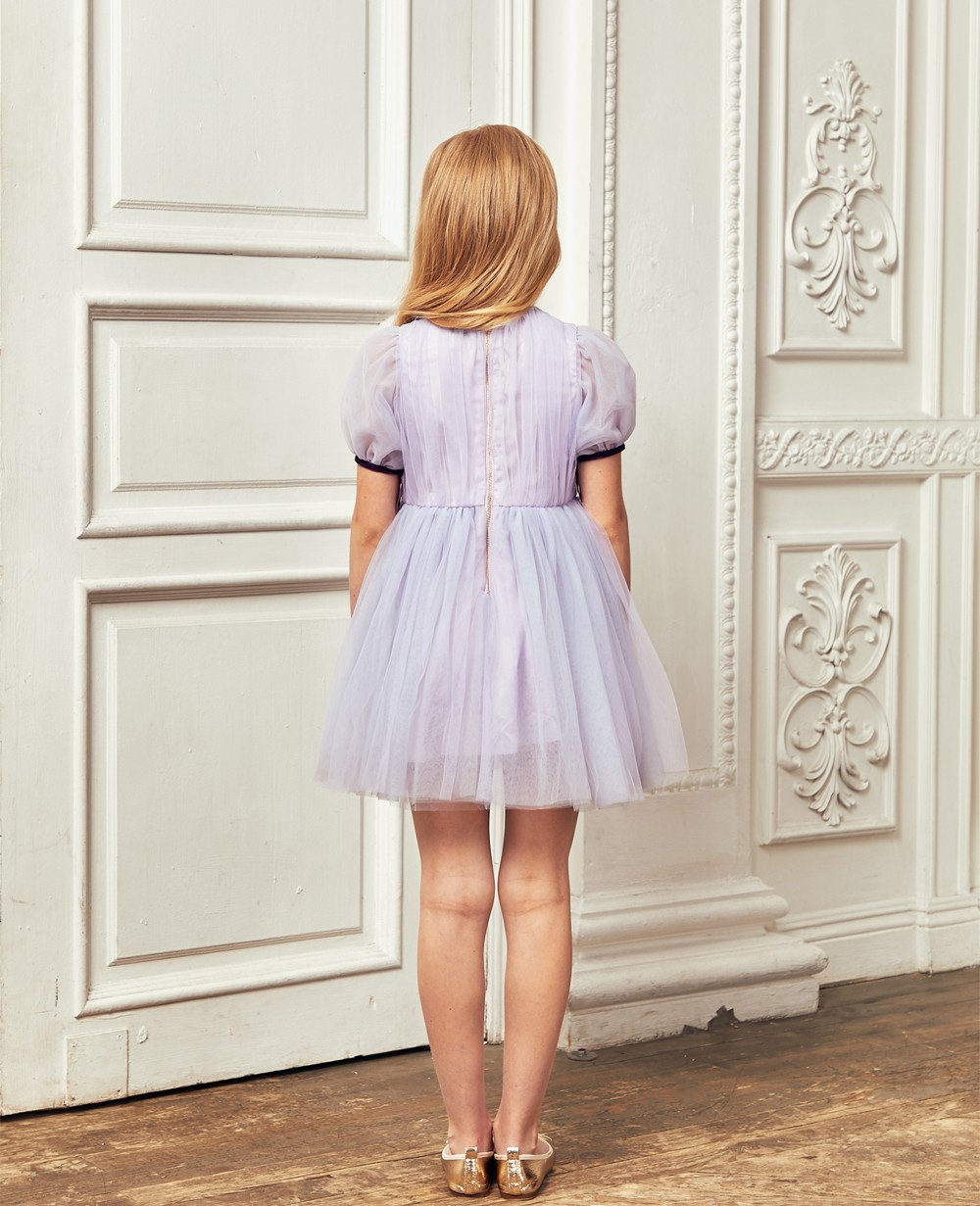 | Description | This lilac tulle dress for girls by Le Mu, with floral sequins emblishment on the shoulder and waist. It has a layers of purple and blue tuelle , with a cotton lining for comfort. There is a gold metal logo charm sewn on the waist. This sleeveless dress is lined in satin backed in soft cotton, and it fastens with a zip on the back. Comes with a pearl hanger and Le Mu dress bag |