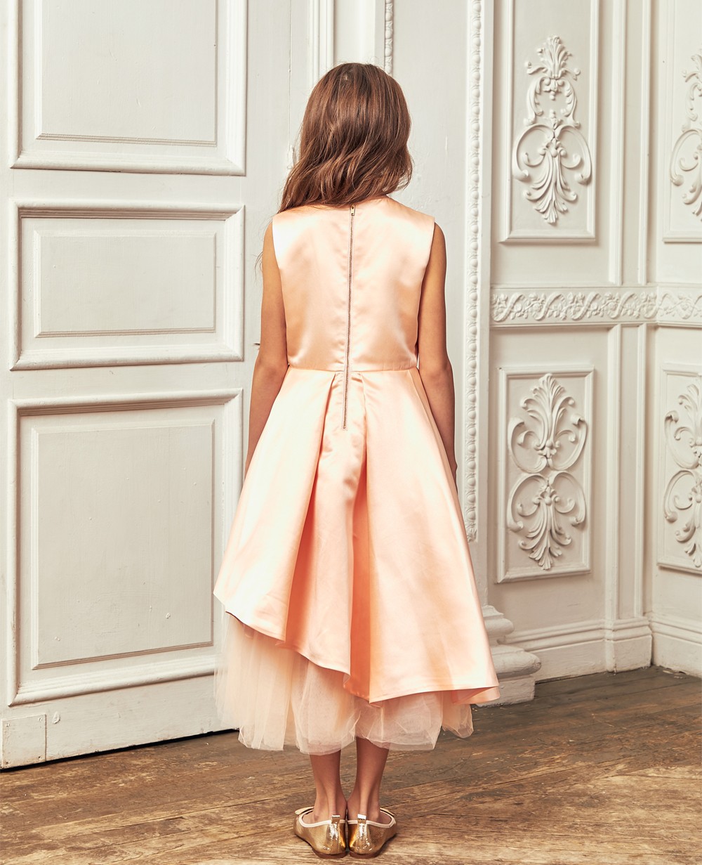 | Description | This gorgeous pink dress made with luxury soft satin, pearl and crystal and beading details. The pleated satin with peach tuelle give the dress full of layers. The sleeveless dress falls under knee dress and is lined in satin backed in soft cotton, and fastens with a zip on the back. Comes with a pearl hanger and Le Mu dress bag |