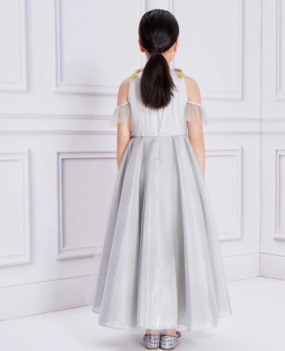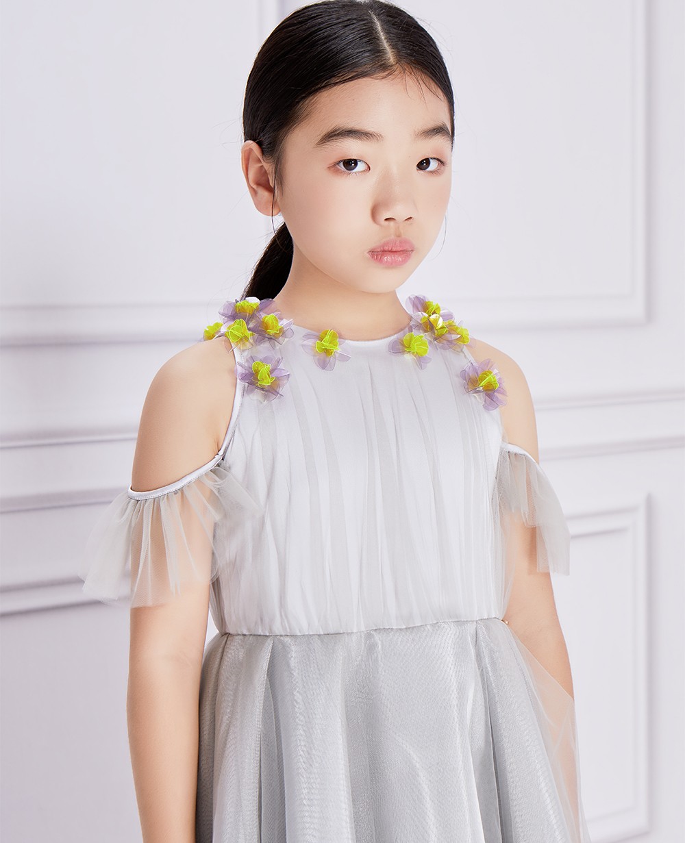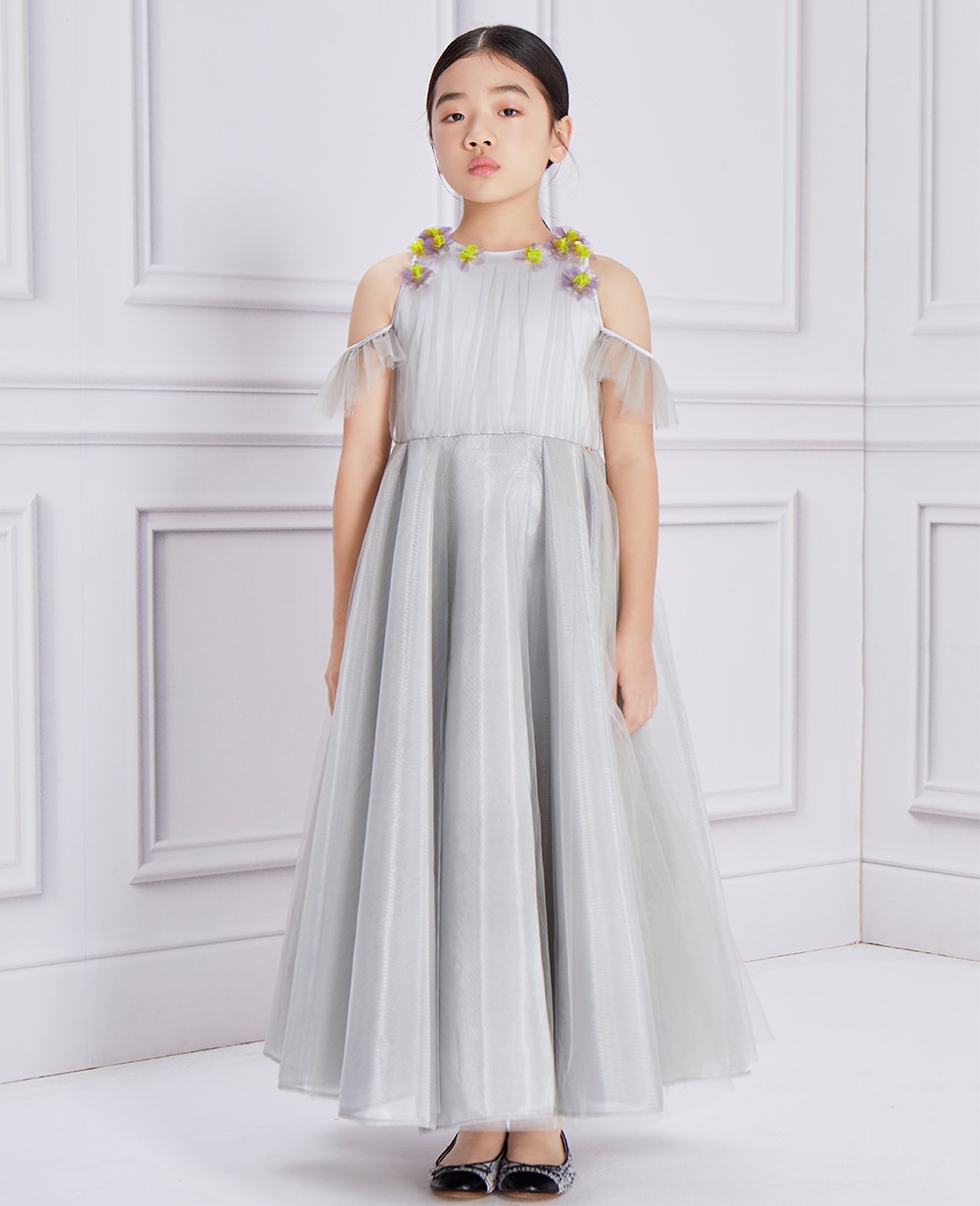 | Description | Dress for the occasion in this elegant long dress made of sliver mesh with grey tulle. Purple and yellow sequin embellishment with grey ruffle decorate on the shoulders and arms, creating an elegance silhouette. This sleeveless , full length dress is lined in satin backed in soft cotton, and it fastens with a zip on the back. Comes with a pearl hanger and Le Mu dress bag |