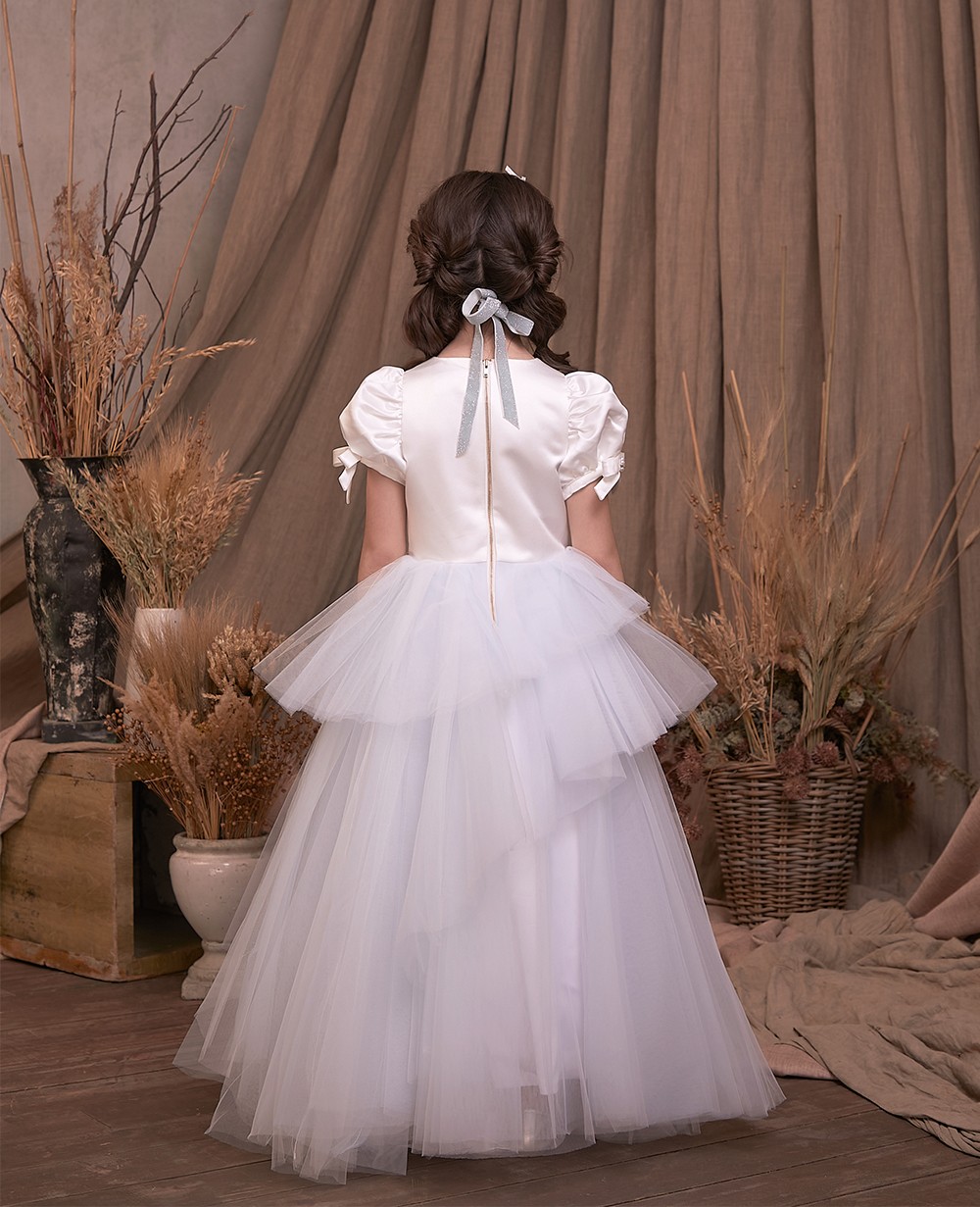 | Description | This dress is one of our finest signature creations here at Le Mu, made with luxury soft satin, it has crystals embroidery crossed body. This fancy white and baby blue ruffle dress is a dream with a long flowing skirt. The puff sleeves dress layered tulle gathered skirt makes this fine children’s special occasion dress simply breathtaking. This dress is lined in satin backed in soft cotton. It fastens with a zip on the back and comes with a pearl hanger and Le Mu dress bag |