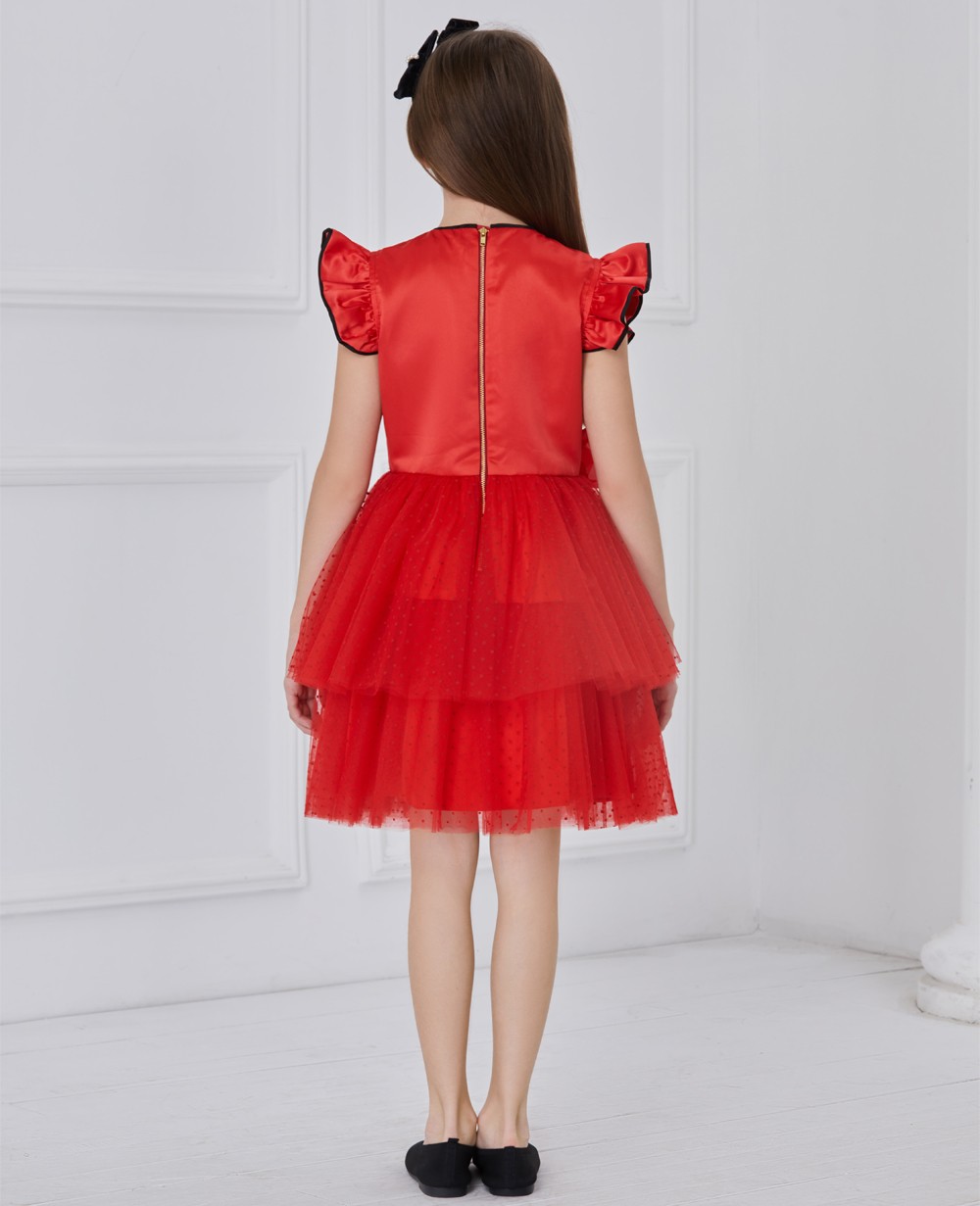 Description This red satin tulle dress for girls by Le Mu with raffle sleeves, black line on the edges of sleeves and a neckline ribbon. With a handmade organza flower decorated on the waist, red polka dot tulle gives the dress full of layers with cotton lining for comfort. This dress is lined in satin backed in soft cotton, and it fastens with a zip on the back. Comes with a pearl hanger and Le Mu dress bag