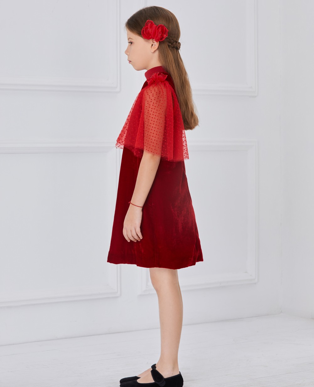 Description This stunning dress is made with dark red velvet with red polka dot tulle sleeves. The handmade organza flora is decorated on the shoulder, The sleeves dress falls above knees and is lined in satin backed in soft cotton, and it fastens with a zip on the back. Comes with a pearl hanger and Le Mu dress bag.