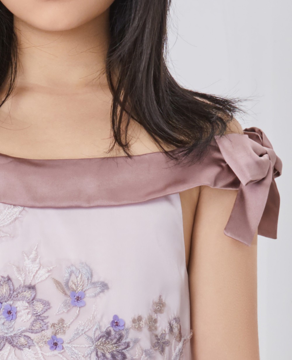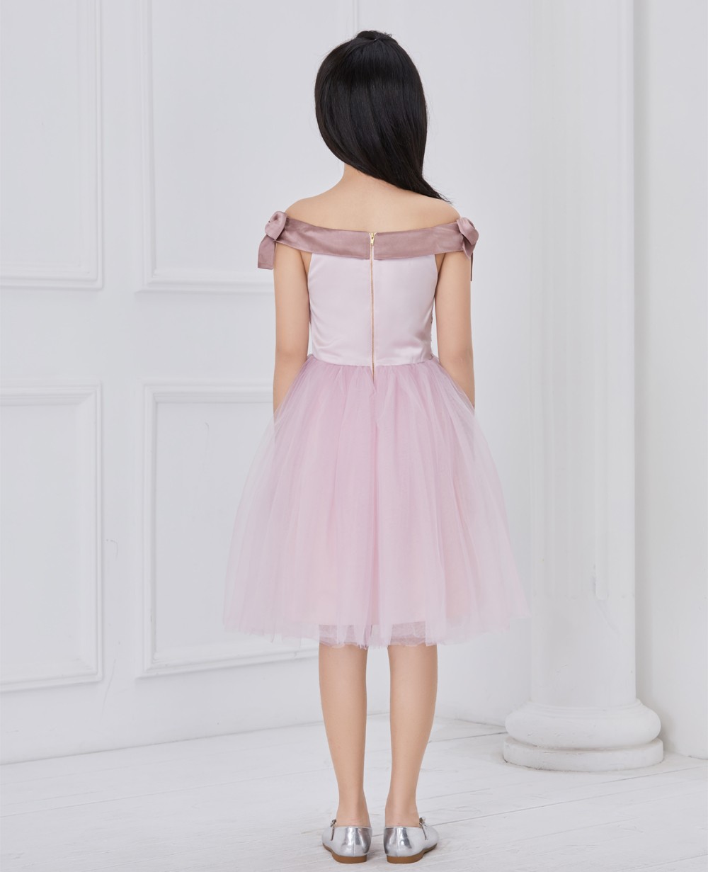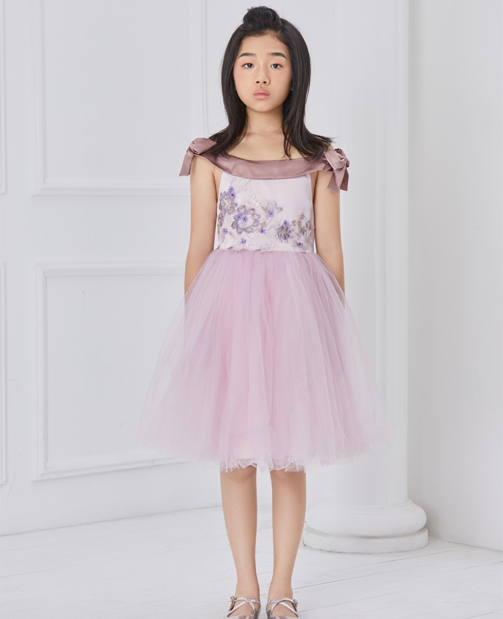 Description This beautiful Le Mu dress is made with baby pink satin, it has big bow detail on the shoulder,purple lace embroidery with purple sequin decorate on the chest, and pink purple tuelle on the bottom gives the dress full of layers . This dress is lined in satin backed in soft cotton, and it fastens with a zip on the back. Comes with a pearl hanger and Le Mu dress bag