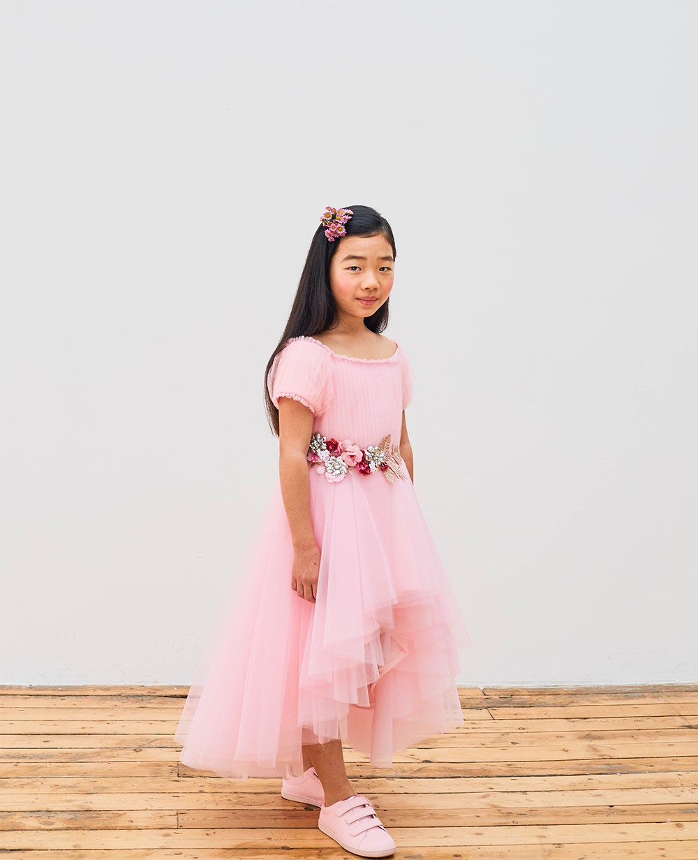 | Description | Get star struck with Le Mu's pretty pink tulle dress with all the flair and flounce of its tulle skirt creating an vision of enchantment. Round necked and short sleeves, the tulle skirted dress is belted at its waist with ruched effect top. An elegant wedding dress for special occassions.Come with hanger and dust bag. |