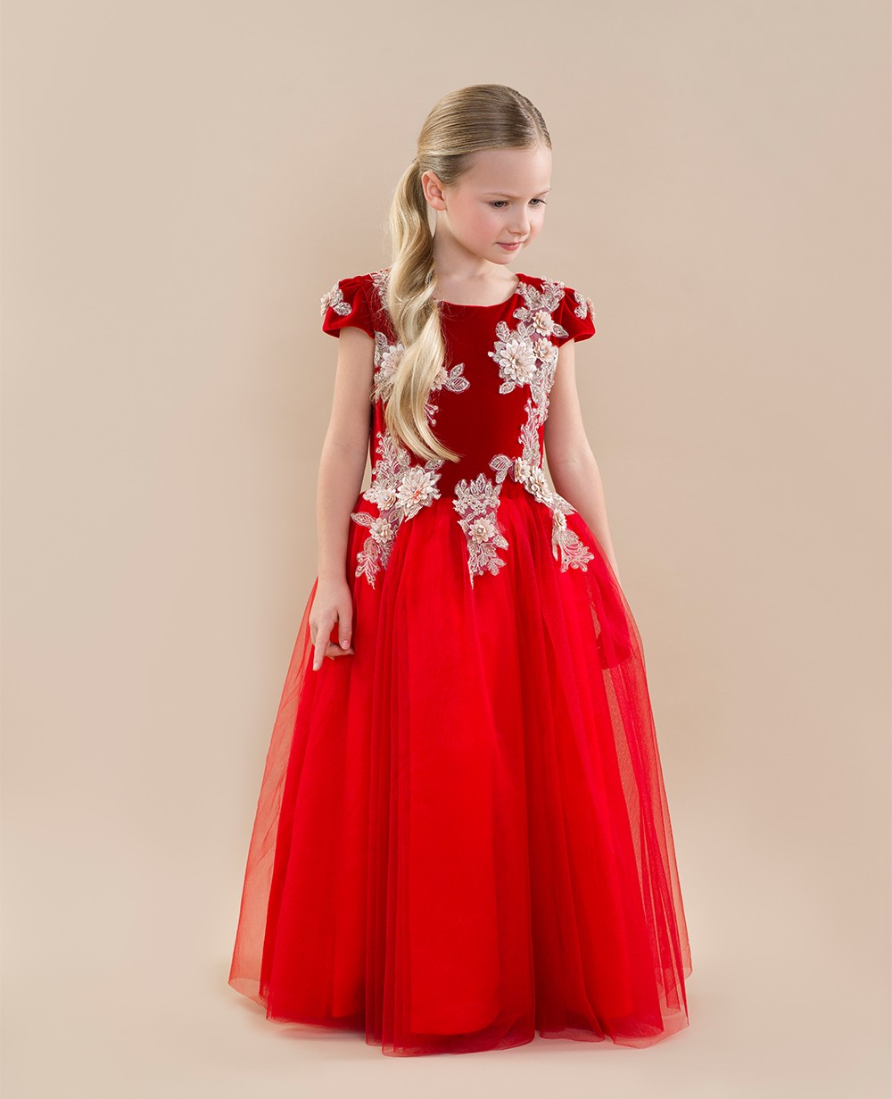 This lace dress is a must-have style for your girl to wear for any special occasion. The dark red maxi dress, with sequin detailed wasit, short sleeves and frill skirt really give this children’s wear dress an exclusive look.