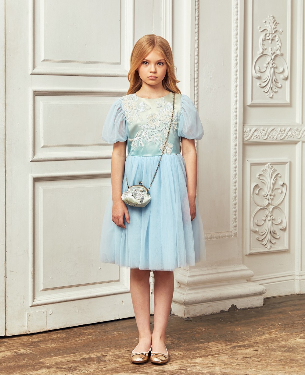 | Description | This baby blue tulle dress for girls by Le Mu, with floral lace embroidery on the chest. It has a layers of blue tuelle and satin, with a cotton lining for comfort. There is a navy blue ribbon around the waist. This puff sleeves dress is lined in satin backed in soft cotton, and it fastens with a zip on the back. Comes with a pearl hanger and Le Mu dress bag |