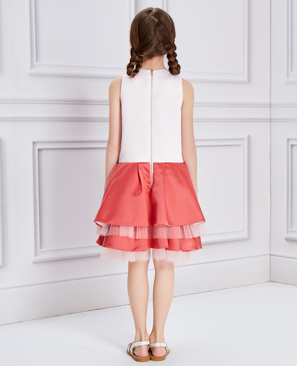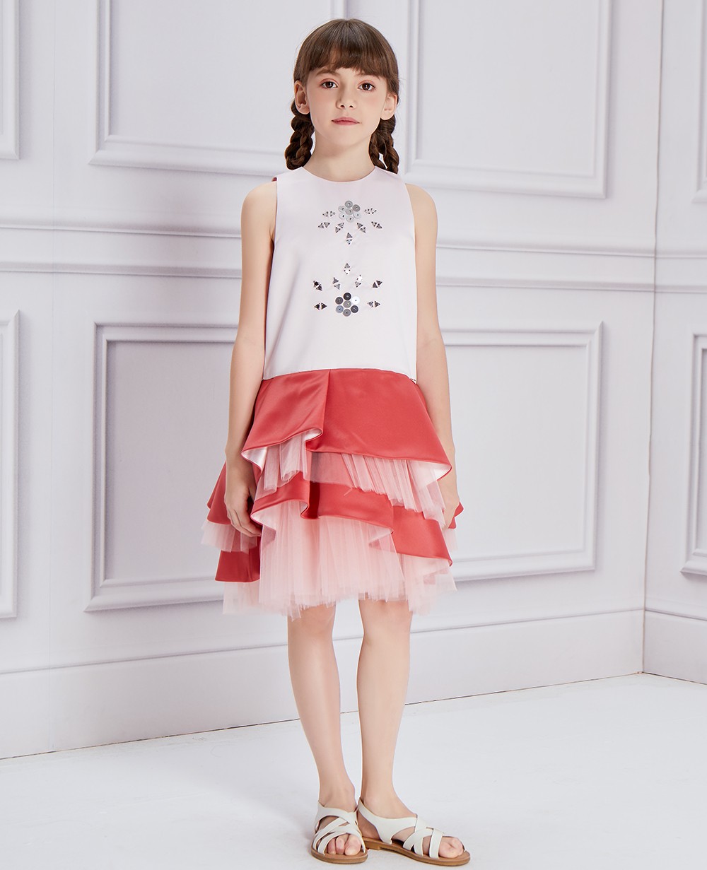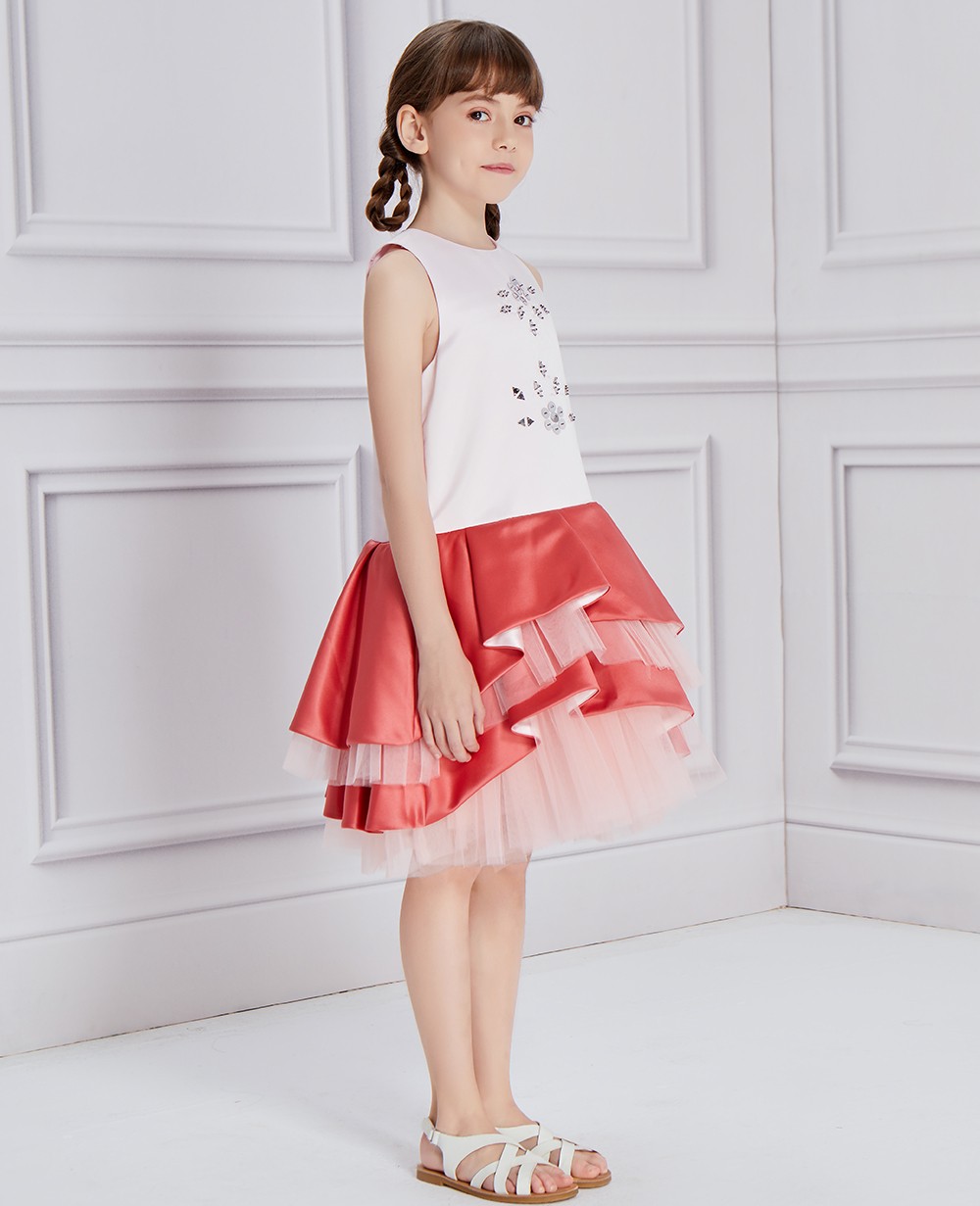| Description | Girls stylish satin and tulle dress by Le Mu. A soft pink satin on the top of the dress with shiny sequin detail on the chest.. on bottom of skirt, red satin with pink tuelle give the dress full of layers and lined in soft cotton for comfort. Fastens with a zip on the back and comes with a pearl hanger and Le Mu dress bag. |