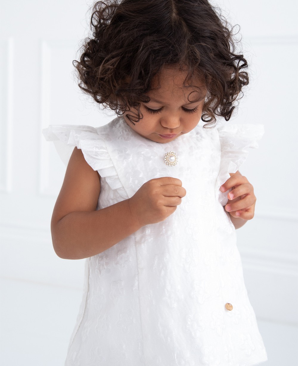 | Description | A princess baby girl dress like no other. Made in white brocade with A line shap dress. It has pearl detail on the chest and white brocade fly sleeves, baby white fly sleeves dress is lined in soft cotton, and it fastens with a zip on the back. Comes with a pearl hanger, matching kickers and dress bag |