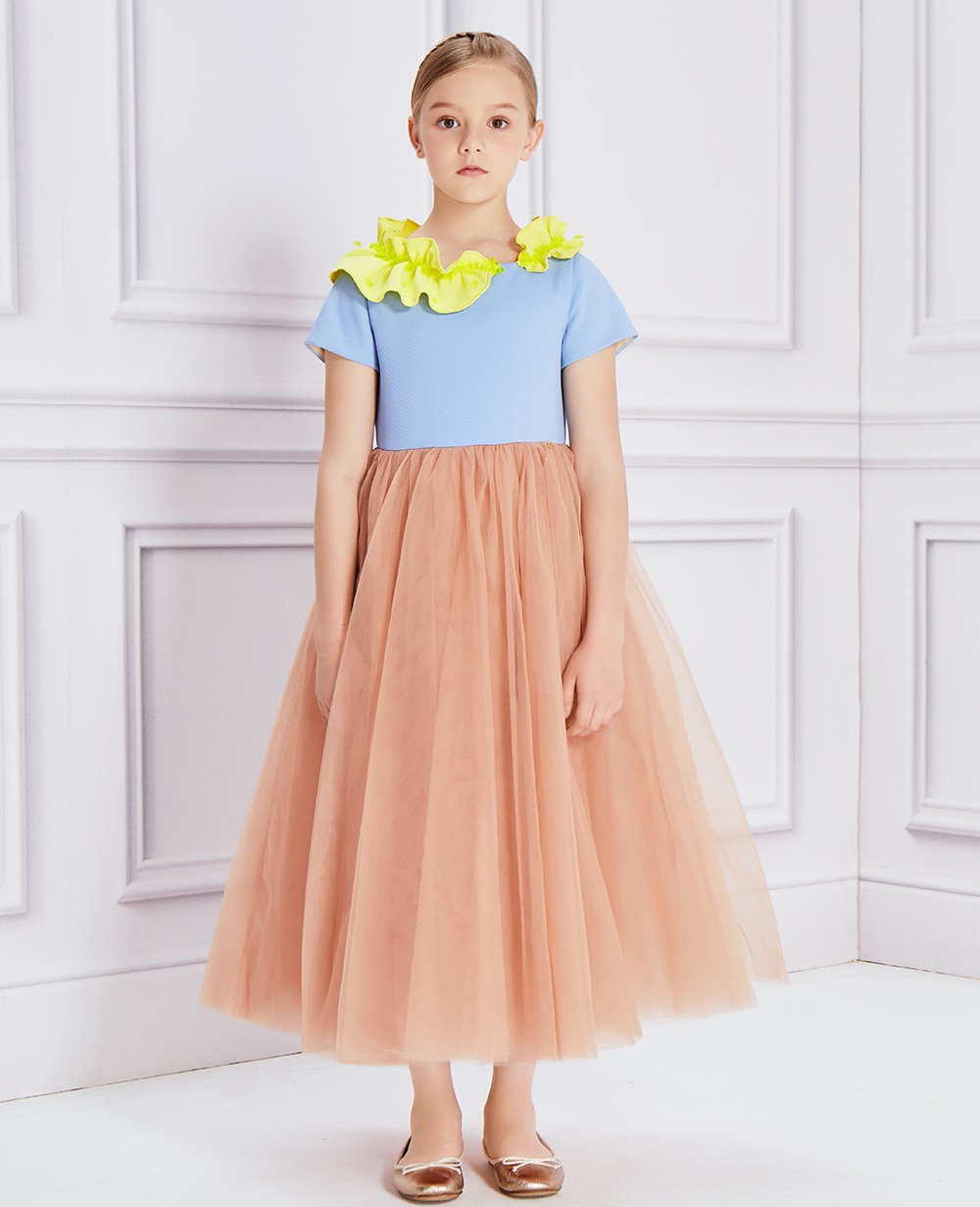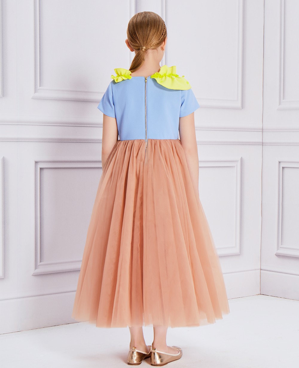 | Description | This beautiful Le Mu dress is made with sky blue satin, a pleated yellow leaf with sequin embellishment around the neck, and rose gold tulle on the bottom gives the dress full of layers . This dress is lined in satin backed in soft cotton, and it fastens with a zip on the back. Comes with a pearl hanger and Le Mu dress bag |
